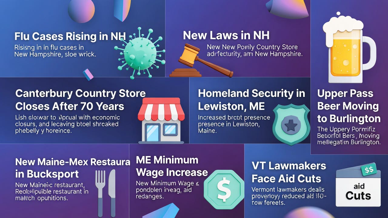 Flu cases continue to rise across New Hampshire: Flu cases are increasing in New Hampshire amid rising respiratory virus activity. Link: https://www.nhpr.org/nh-news/2025-12-31/flu-influenza-raising-cases-nh-new-hampshire-respiratory-virus. Source: NHPR.